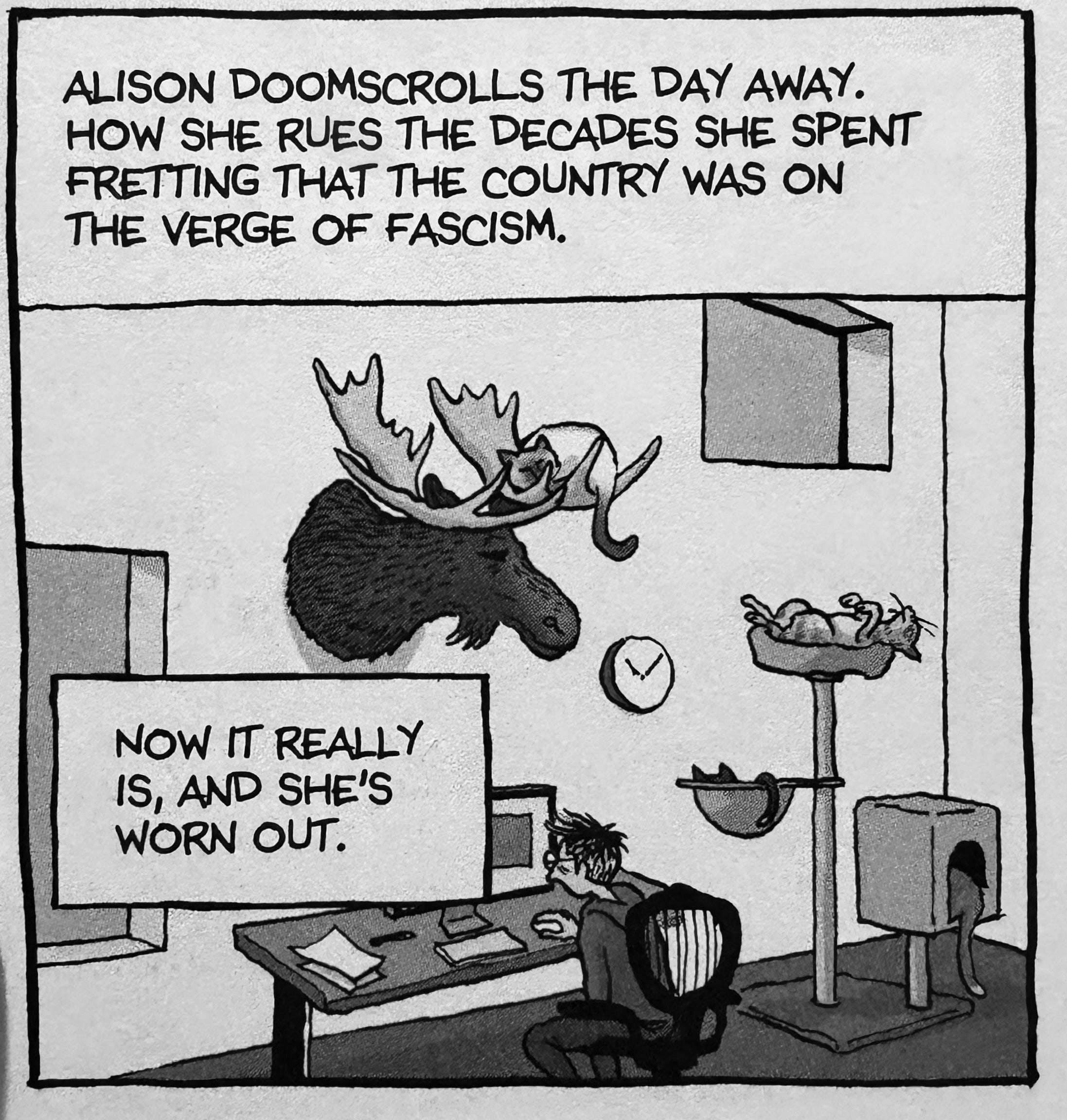 I’ve been reading Alison Bechdel’s (yes, the same Bechdel of The Bechdel Test) latest graphic novel, Spent, and this cell caught me at the perfect time: