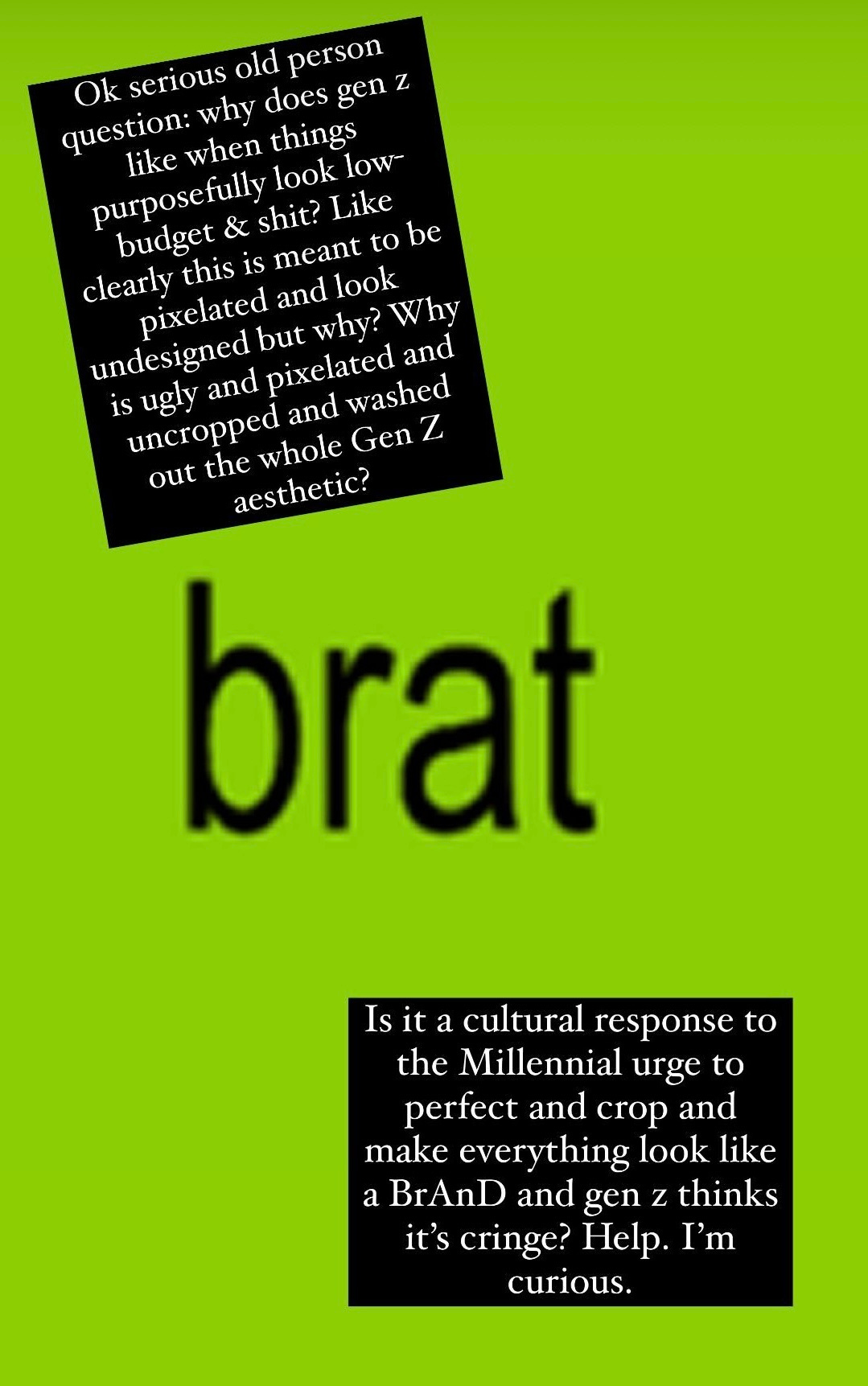A friend also shared this fantastic video with me, created by graphic designer Linus Boman. He does an extensive deep-dive into the design of brat and why it’s speaking to Gen Z, specifically.