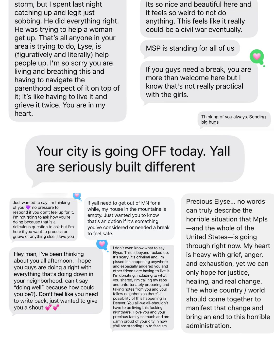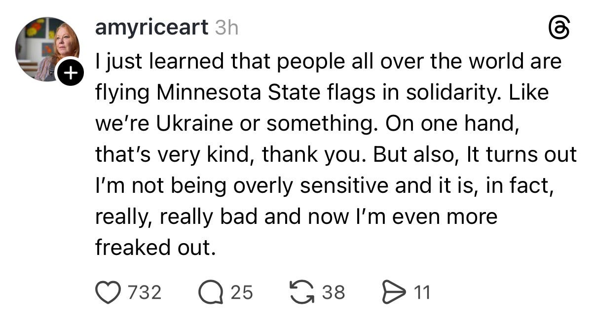 I’ve been getting a LOT of messages from friends and family across the political spectrum who don’t live here asking how we’re doing and how they can show up. Friends have offered us places to stay if we need a break, have sent us cash via Venmo to fund our coffee—it’s been really beautiful to watch so many civic-minded friends and family express concern, outrage, and support. I see you. I appreciate you. I love you.